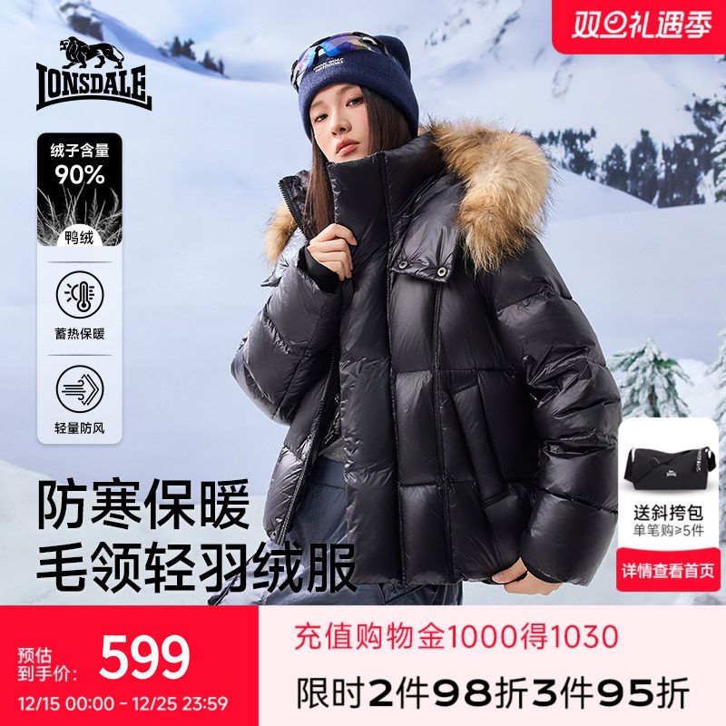 龙狮戴尔户外毛领加绒轻薄羽绒服男女同款连帽保暖座山雕羽绒外套