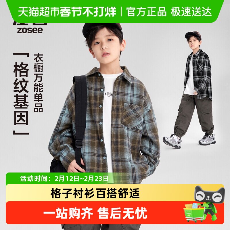 左西童装男童格子衬衫长袖儿童衬衣2026新款上衣男孩春秋大童外套