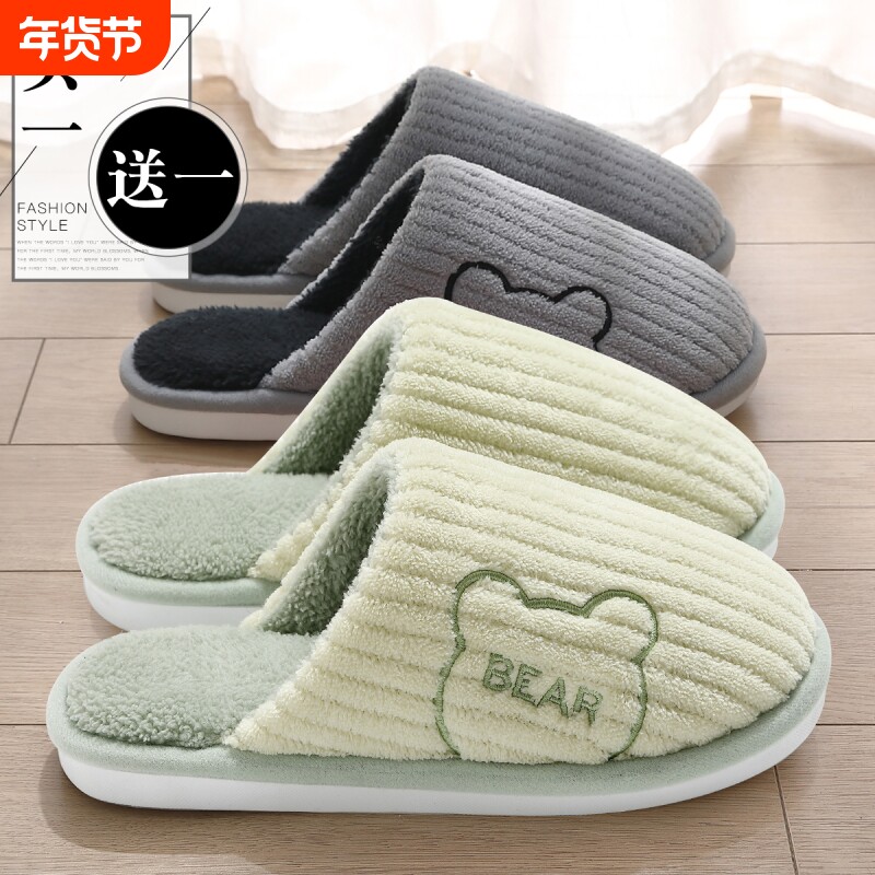 买一送一情侣棉拖鞋女冬季新款室内家居加绒保暖厚软底加绒棉拖女