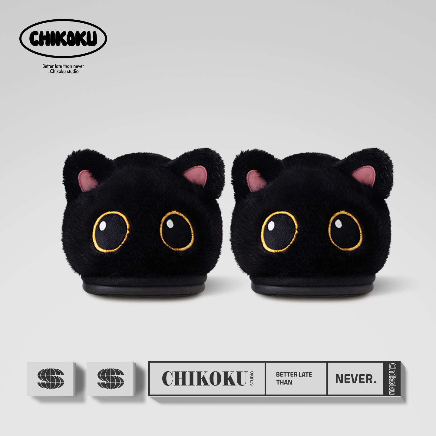 chikoku可爱小黑猫毛毛地板棉拖鞋女冬加绒保暖居家情侣棉拖鞋男