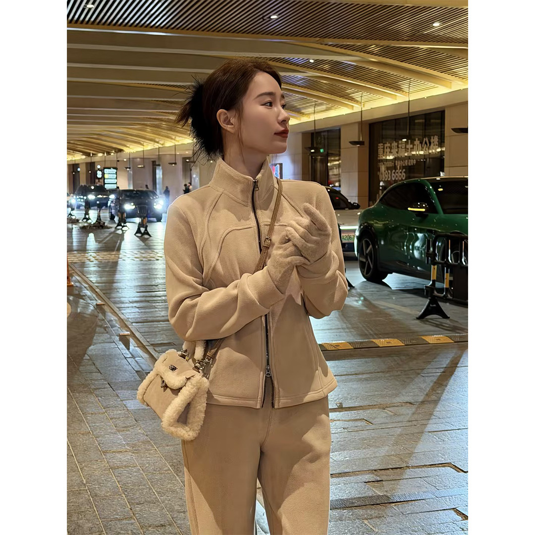 运动风弹力修身加绒加厚纯色立领外套松紧腰直筒休闲裤套装女Q459