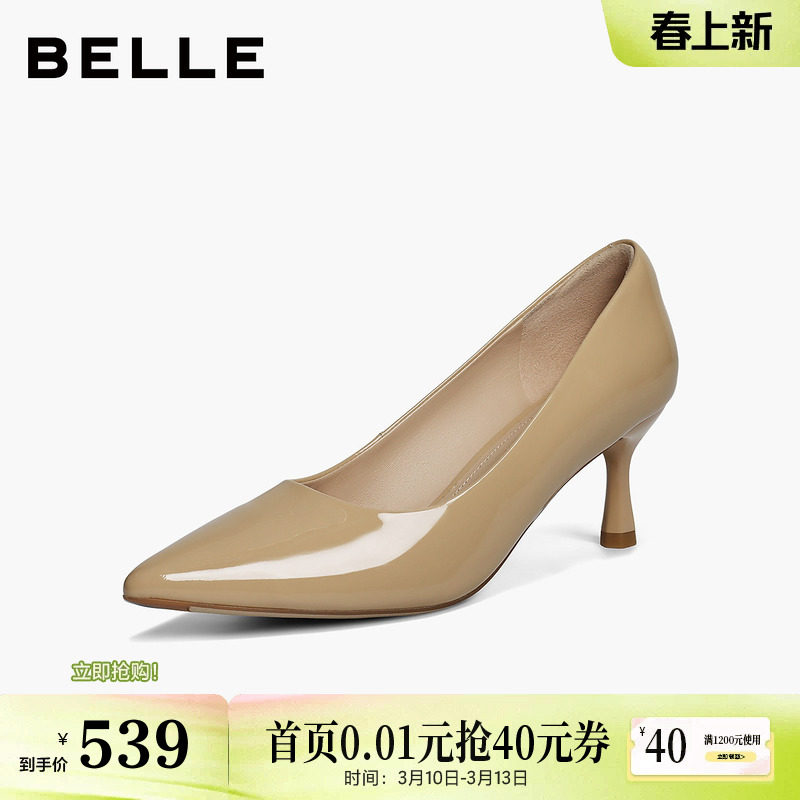 百丽裸色细高跟单鞋女2026春季新款真皮婚鞋子年会宴会F3R1DAQ6