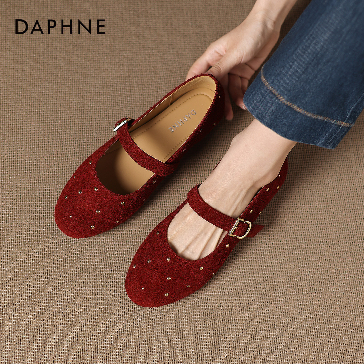 达芙妮红色铆钉单鞋女春季2026新款芭蕾浅口玛丽珍女鞋平底婚鞋子