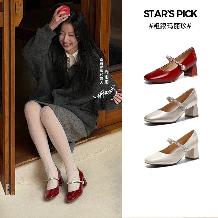 达芙妮红色单鞋女春季2026新款芭蕾方头玛丽珍女鞋法式粗跟婚鞋子