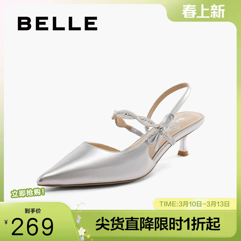 百丽尖头包头凉鞋女夏季新款银色高跟浅口单鞋婚鞋子3X5K1BH5
