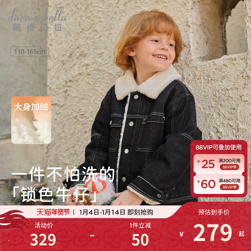 戴维贝拉男童牛仔外套2026冬装新款儿童加绒上衣男孩外衣童装衣服