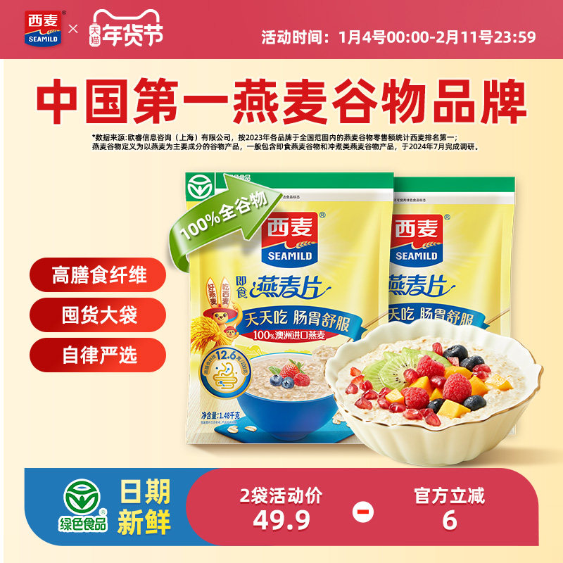 西麦即食纯燕麦片1kg高蛋白质0添加蔗糖即食谷物速食冲饮营养早餐