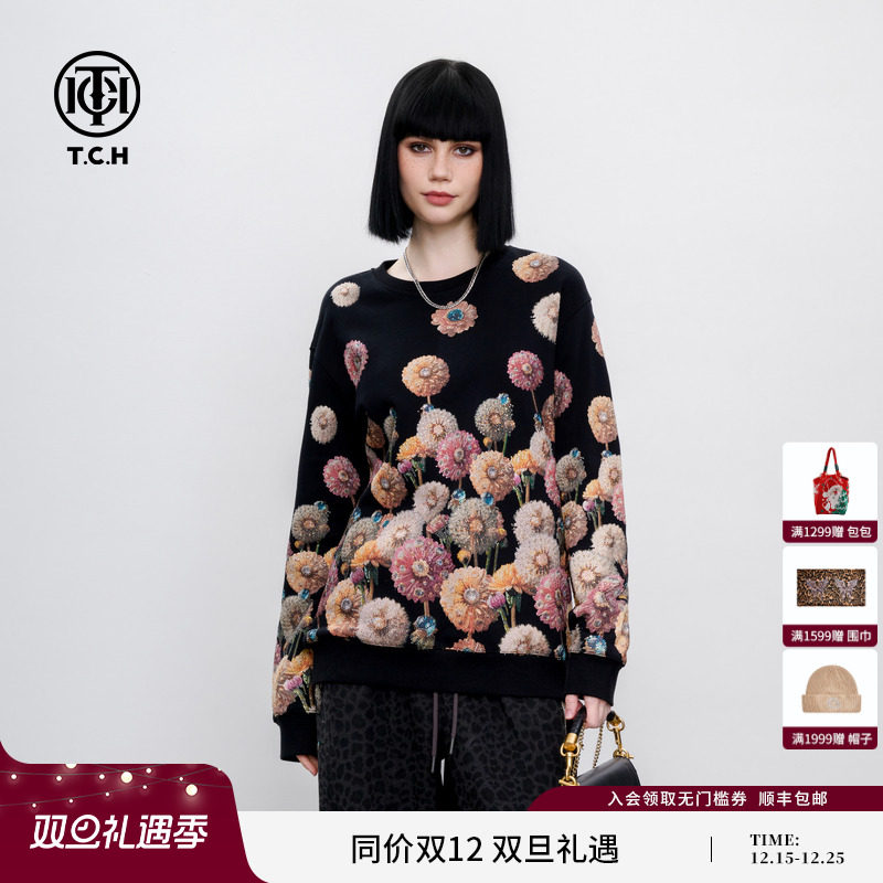 TCH潮酷个性宽松百搭烫钻花朵圆领卫衣男女同款2025年春夏新款