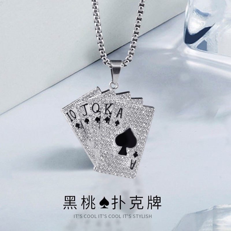 个性大气潮流钛钢卫衣项链嘻哈扑克牌时尚吊坠男女百搭毛衣链配饰
