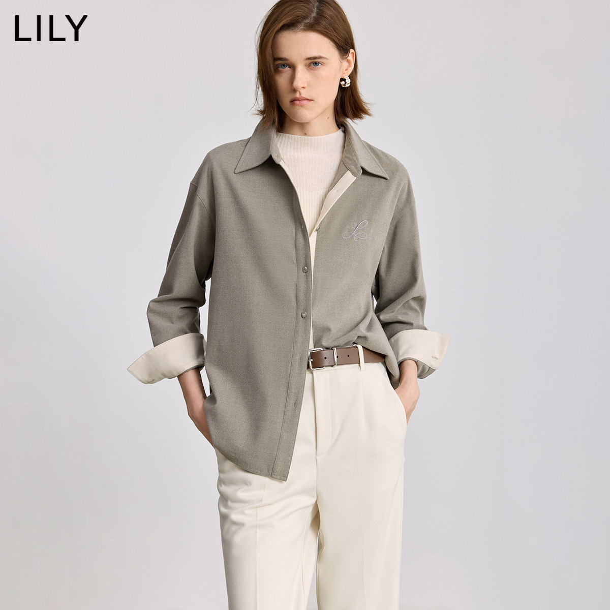 LILY2025冬新款女装双面磨毛法兰绒翻领宽松休闲通勤纯色衬衫外套