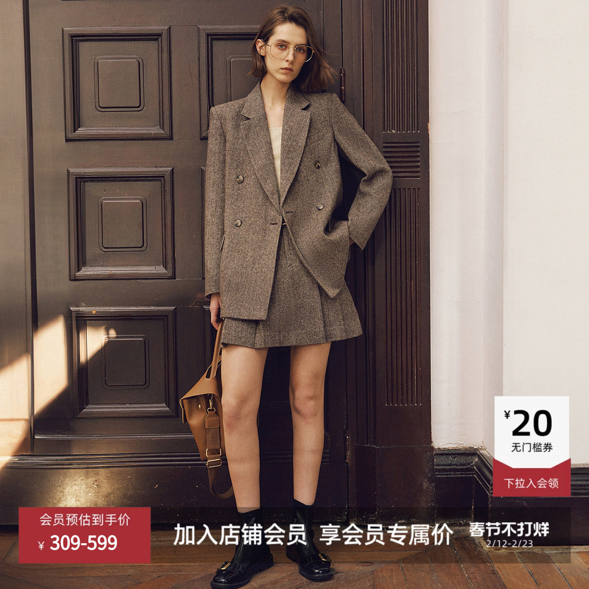 LILY2025冬新款女装羊毛混纺老钱风人字纹气质通勤卡其色西装外套