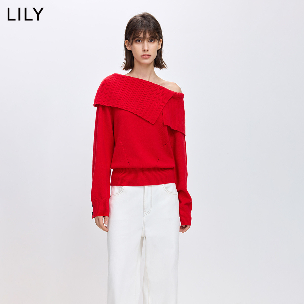 LILY2026春新款女装含羊毛圣诞一字肩露肩红色慵懒风针织衫毛衣
