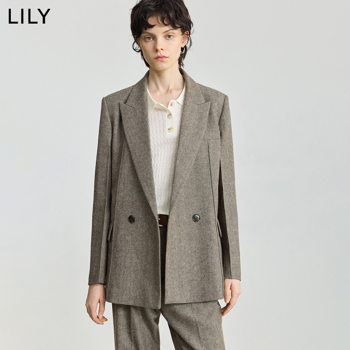 LILY2025新款女装绵羊毛混纺老钱风人字纹驳领廓形通勤西装外套