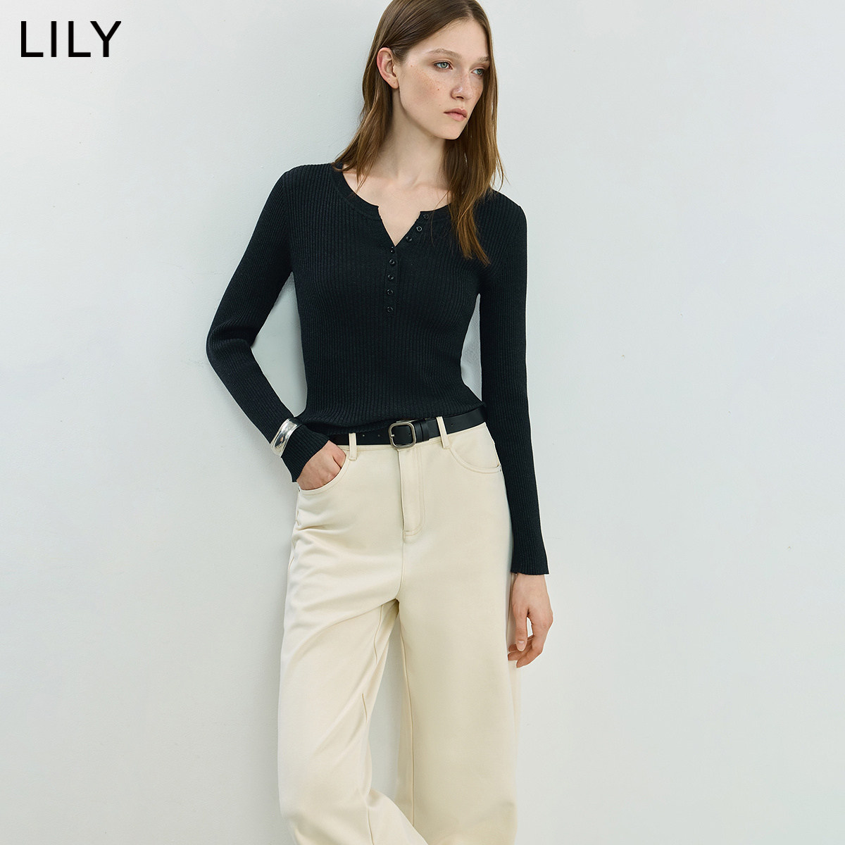 LILY2025新款女装天丝醋酸混纺修身气质通勤纯色针织衫毛衣上衣