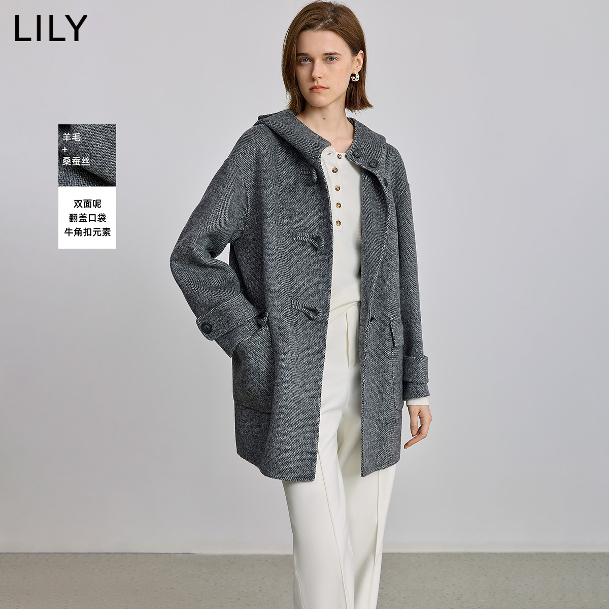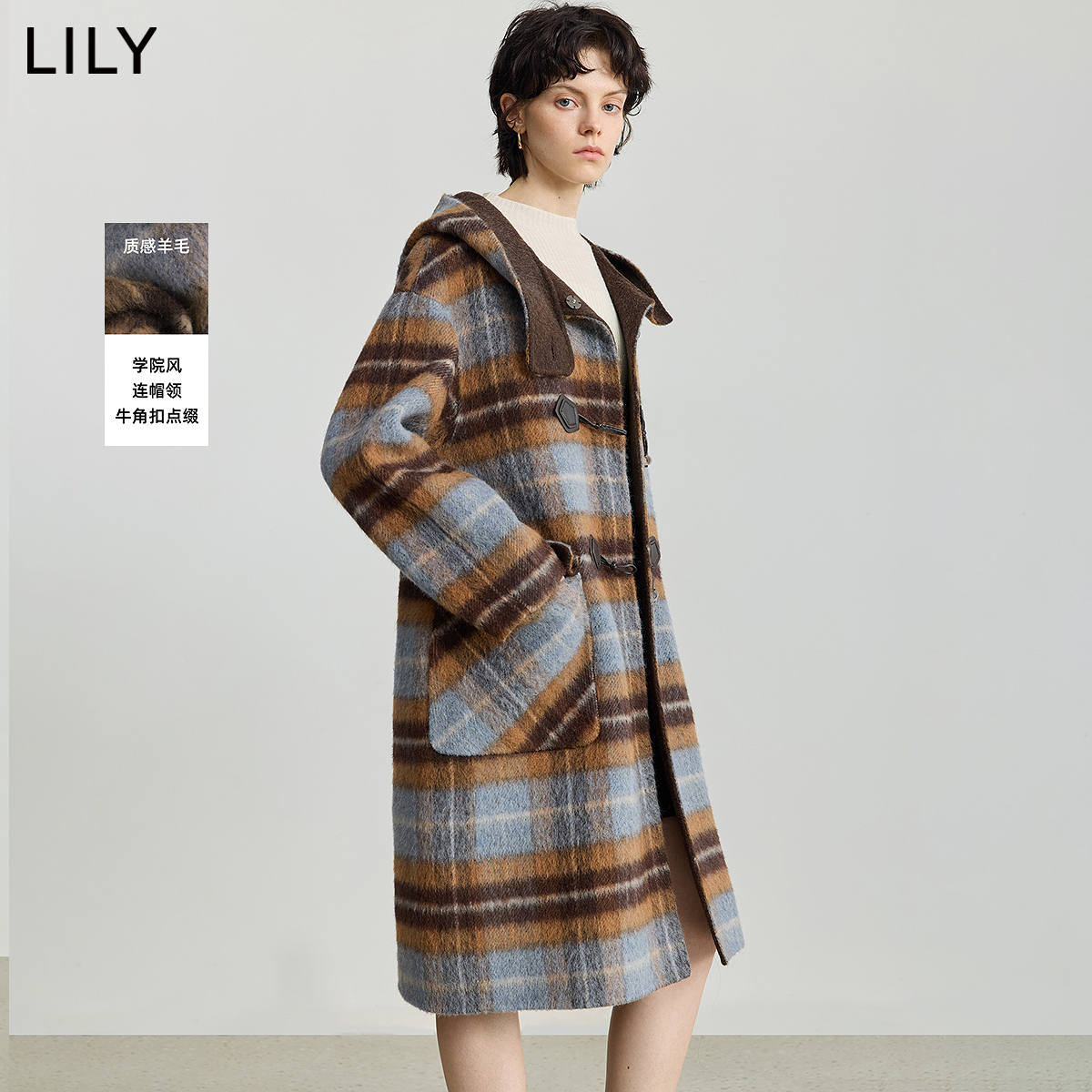 LILY2025冬女装韩版学院风连帽牛角扣长款毛呢森系羊毛大衣外套