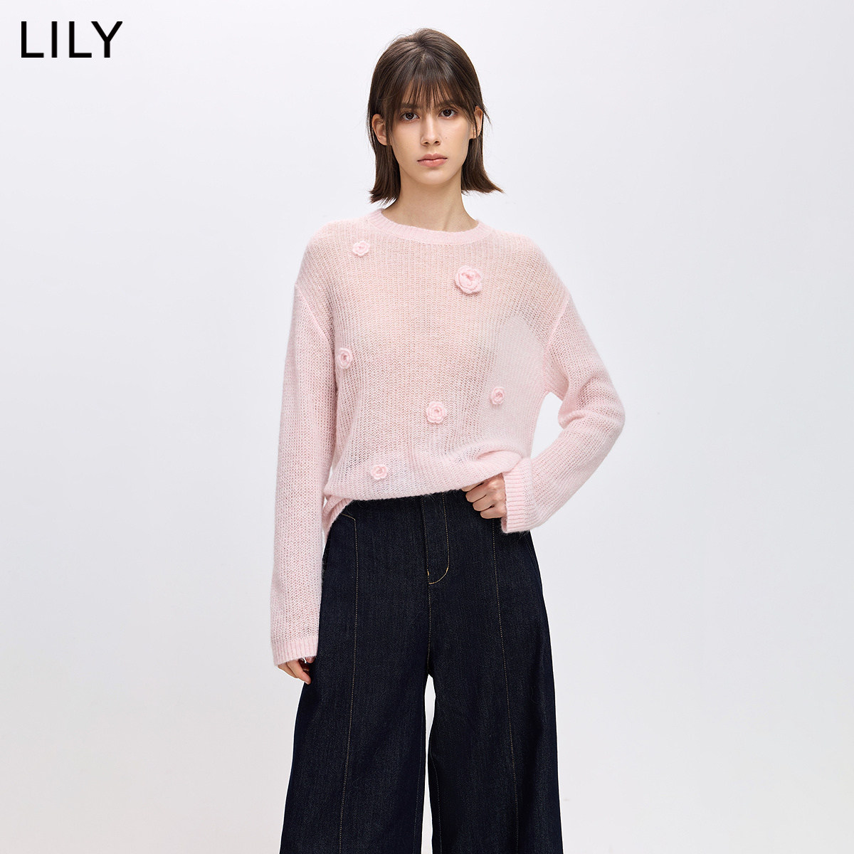 LILY2026春新款女装羊毛上衣薄款罩衫立体花朵浅粉色针织衫毛衣