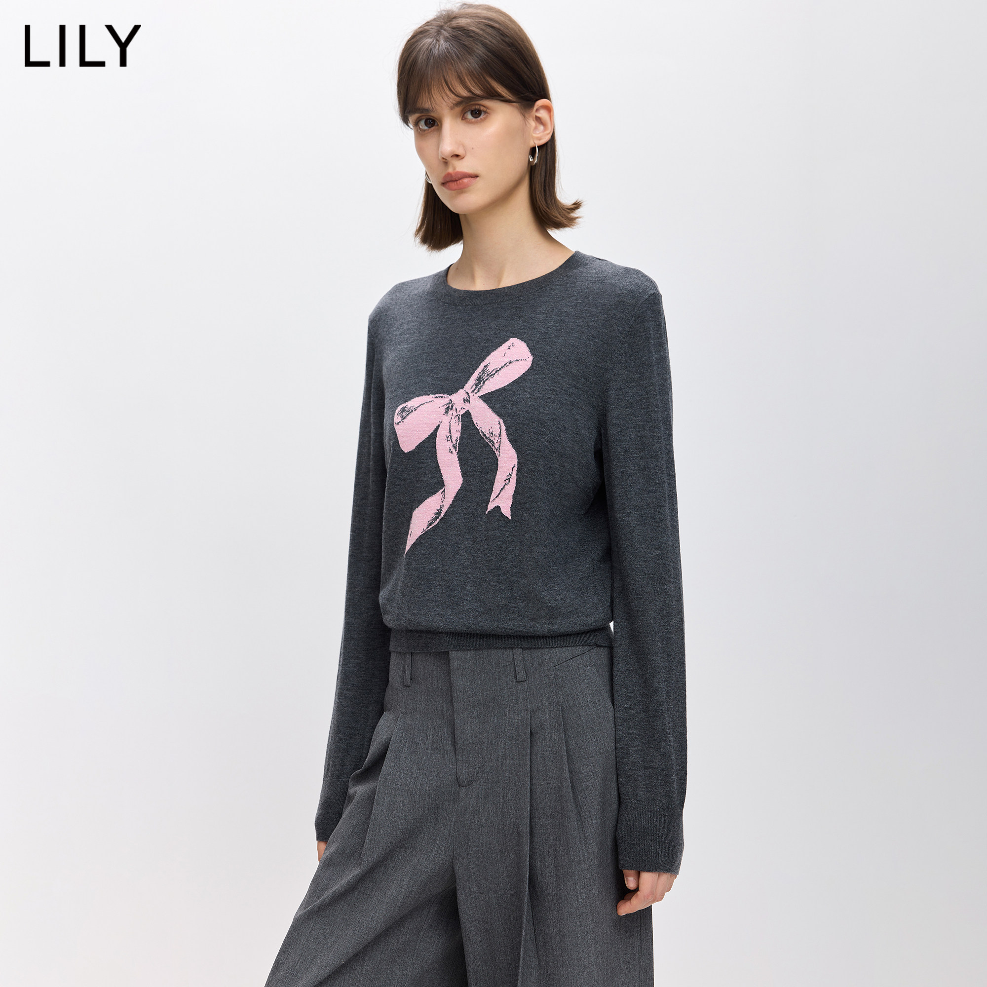 LILY2026春新款女装羊毛混纺格雷系撞色蝴蝶结圆领灰色针织衫毛衣