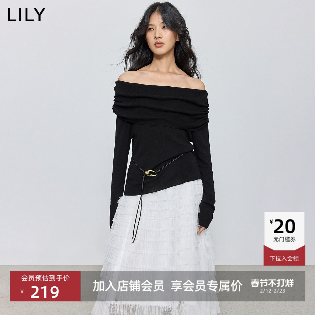 LILY2025新款女装莱赛尔羊毛法式气质一字肩弹力修身长袖针织衫
