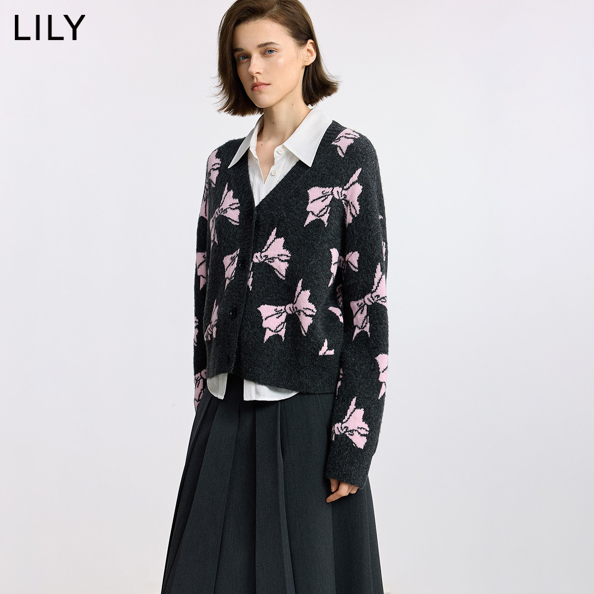 LILY2025冬新款女装含羊毛设计感撞色蝴蝶结V领针织开衫外套毛衣