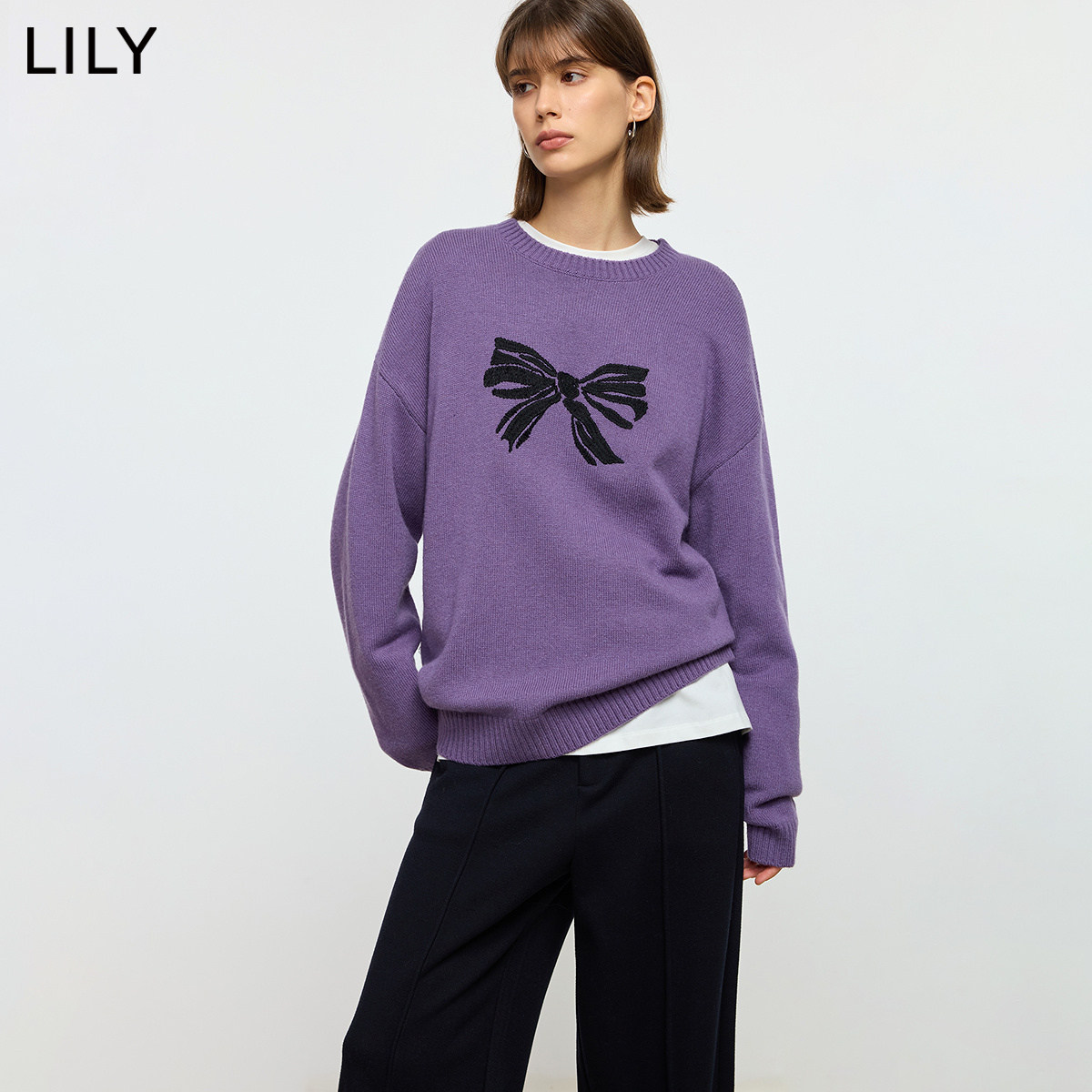 LILY2025冬新款女装含羊毛软糯撞色蝴蝶结宽松圆领套头针织衫毛衣