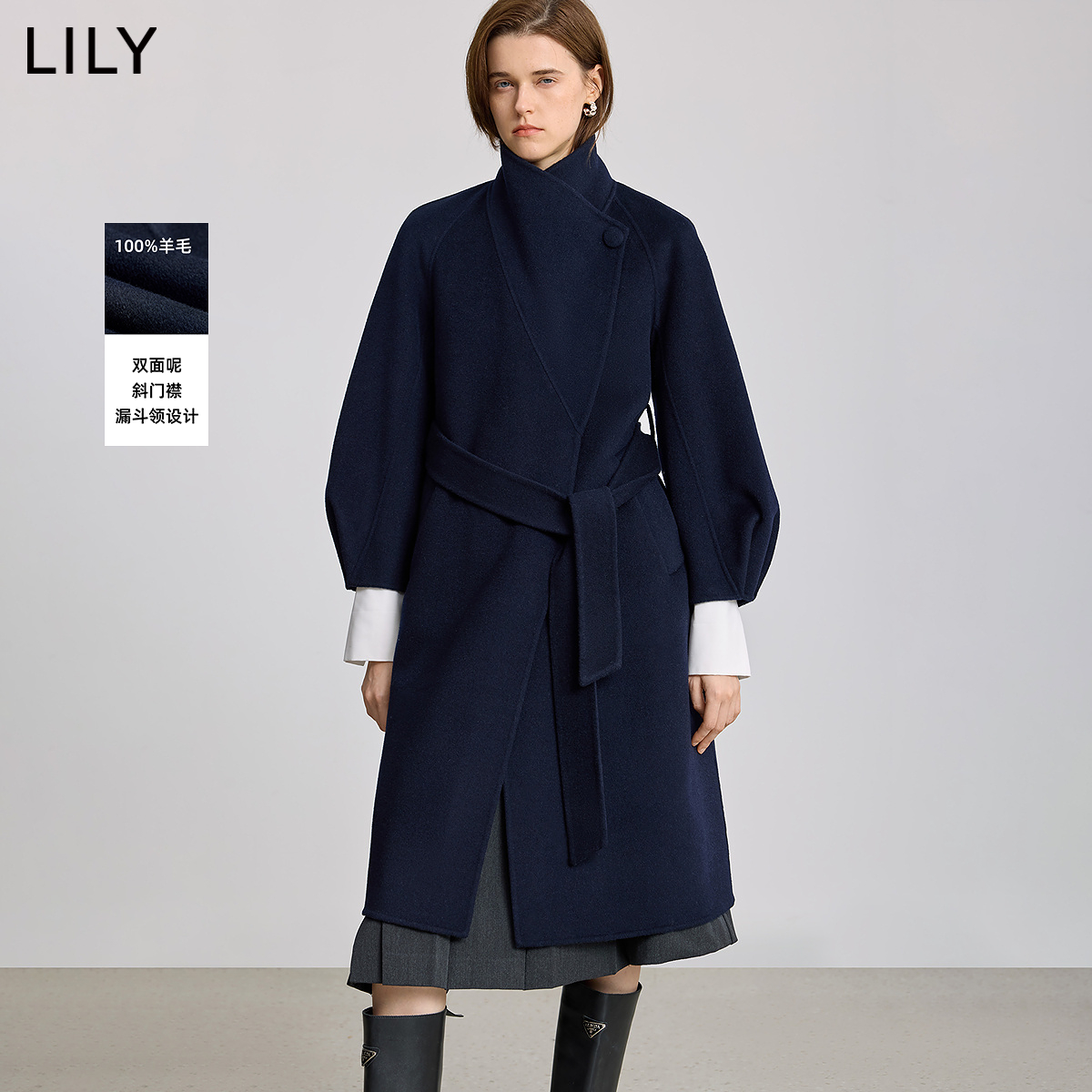 100%羊毛LILY2025冬新款女装格雷系气质通勤腰带毛呢大衣外套长款