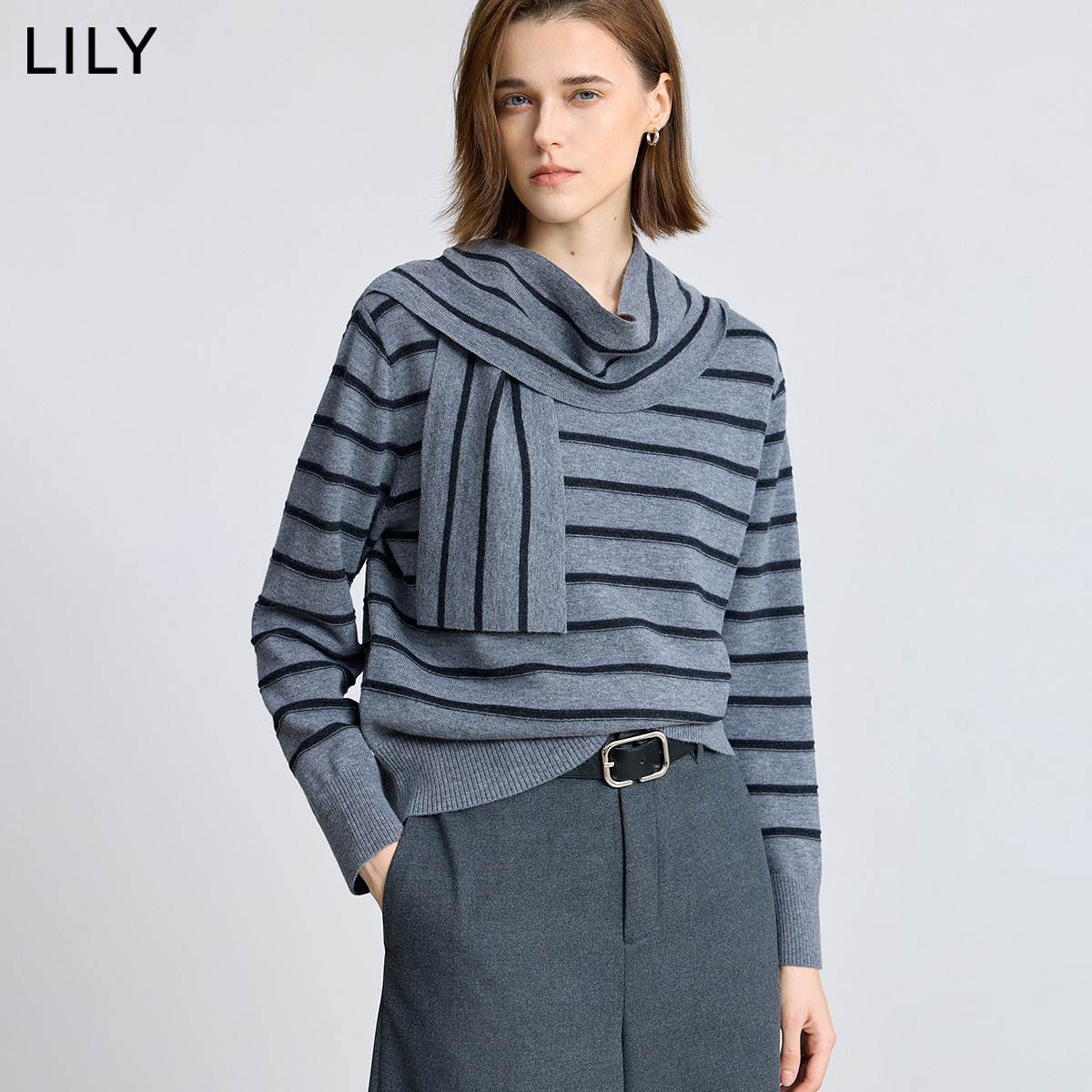 100%美丽诺羊毛LILY2025冬新款女装含围巾撞色条纹通勤灰色针织衫