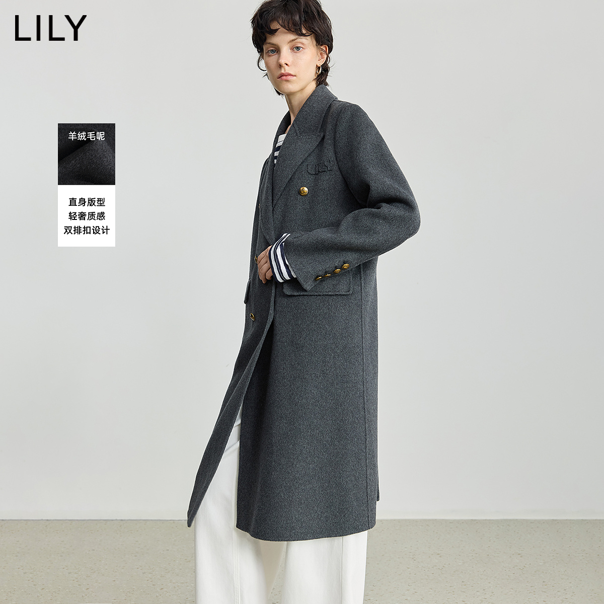 LILY2025冬新款女装羊毛混纺轻奢长款灰色大衣气质通勤毛呢外套