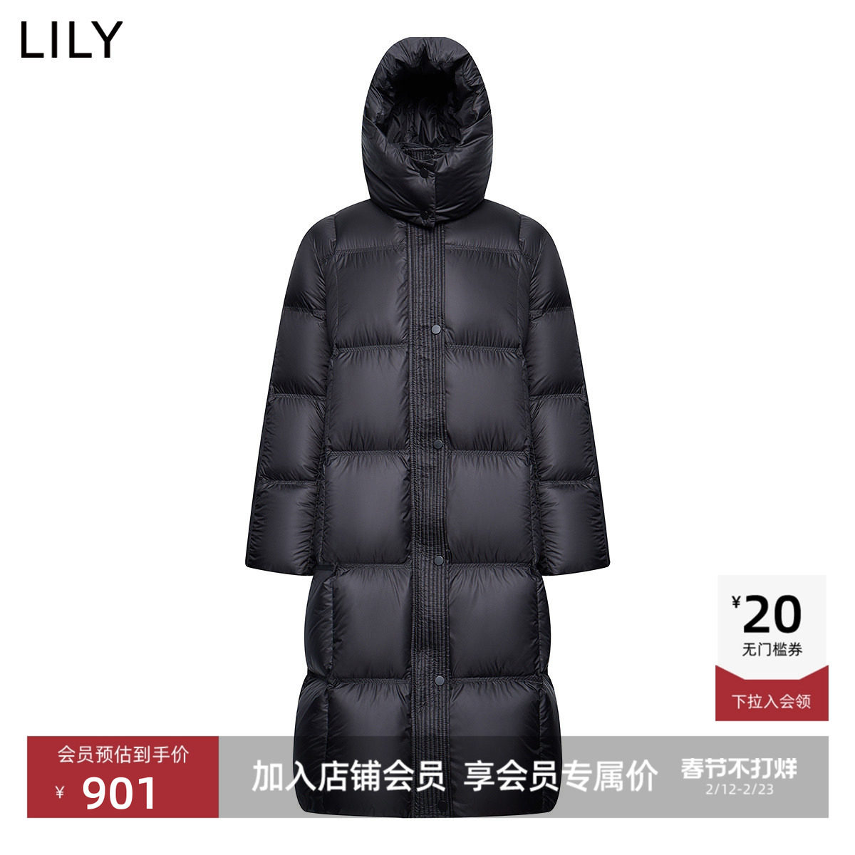 双面穿LILY2025冬新款女装连帽90鸭绒宽松廓形三防羽绒服外套长款