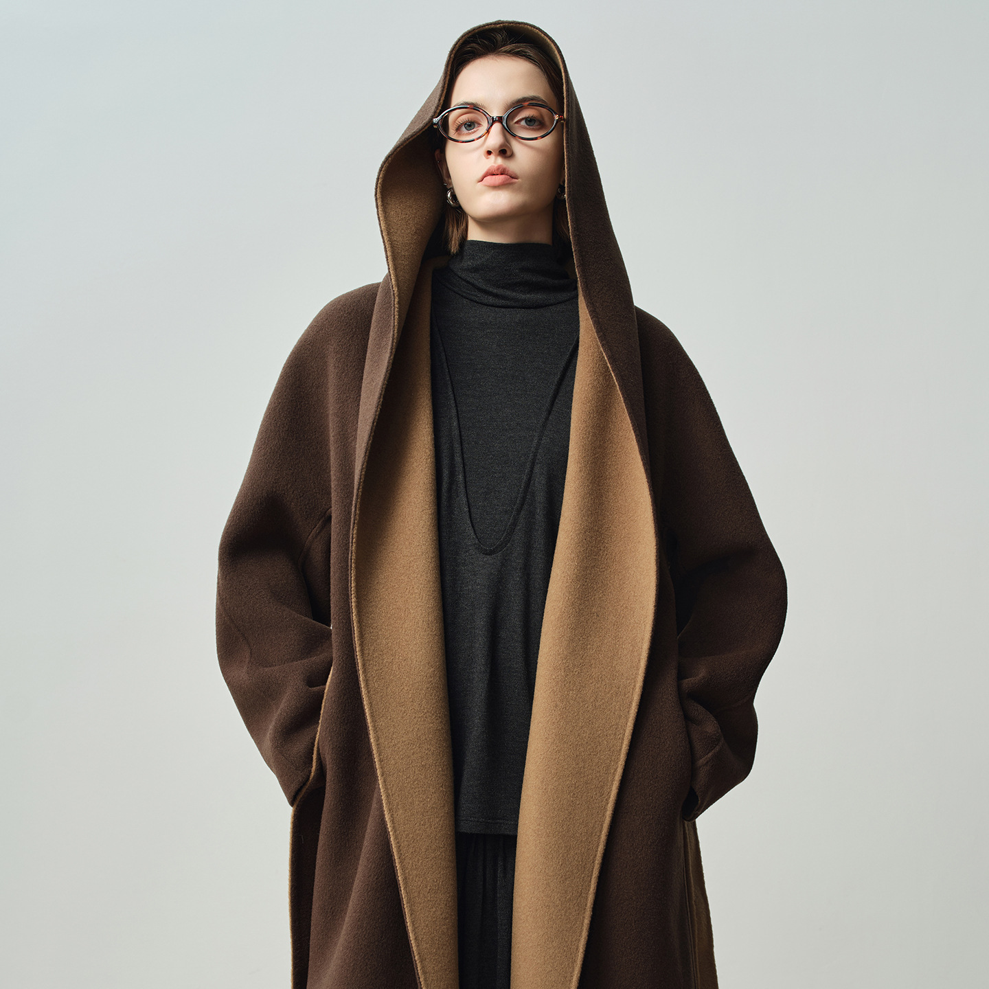 2025秋冬女装新款撞色设计感浴袍连帽长款羊绒大衣女慵懒风双面呢
