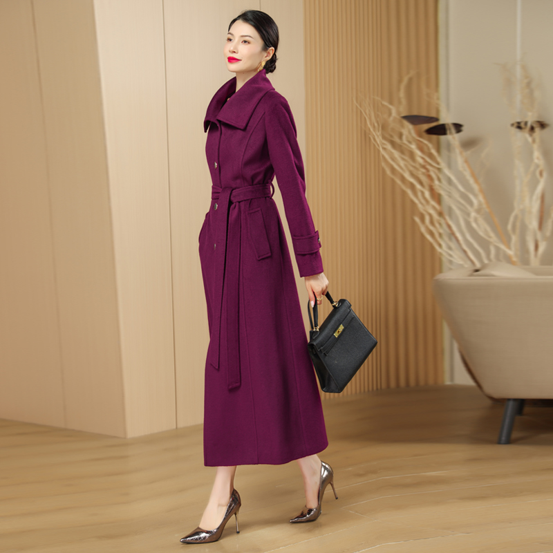 FINITY菲妮迪毛呢外套2025冬季新款简约紫色双面呢长款羊绒大衣女