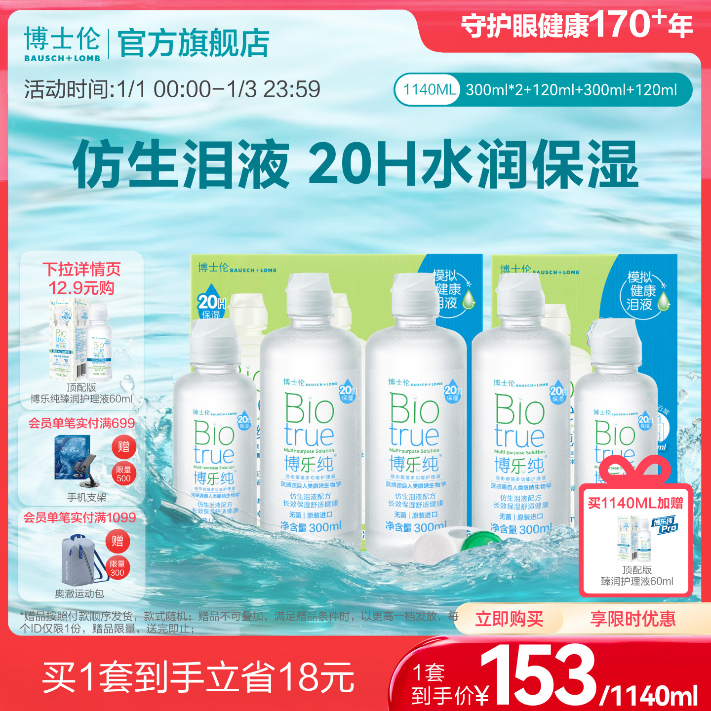 博士伦润明臻净隐形近视眼镜护理液60ml清洗药水升级 顺手买一件