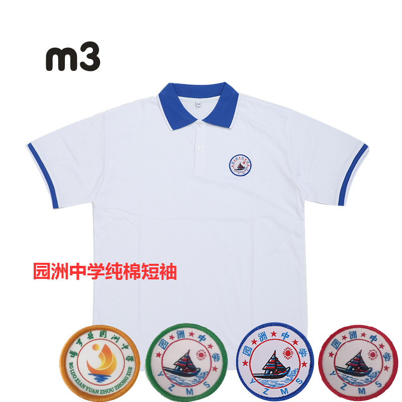 惠州市园洲中学生校服纯棉面料短袖翻领T恤白色条杠短裤男女通用
