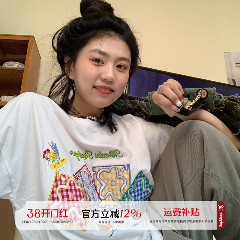 橘子树在哪儿 方块绣花短袖T恤女夏宽松白色体恤学生甜美可爱半袖