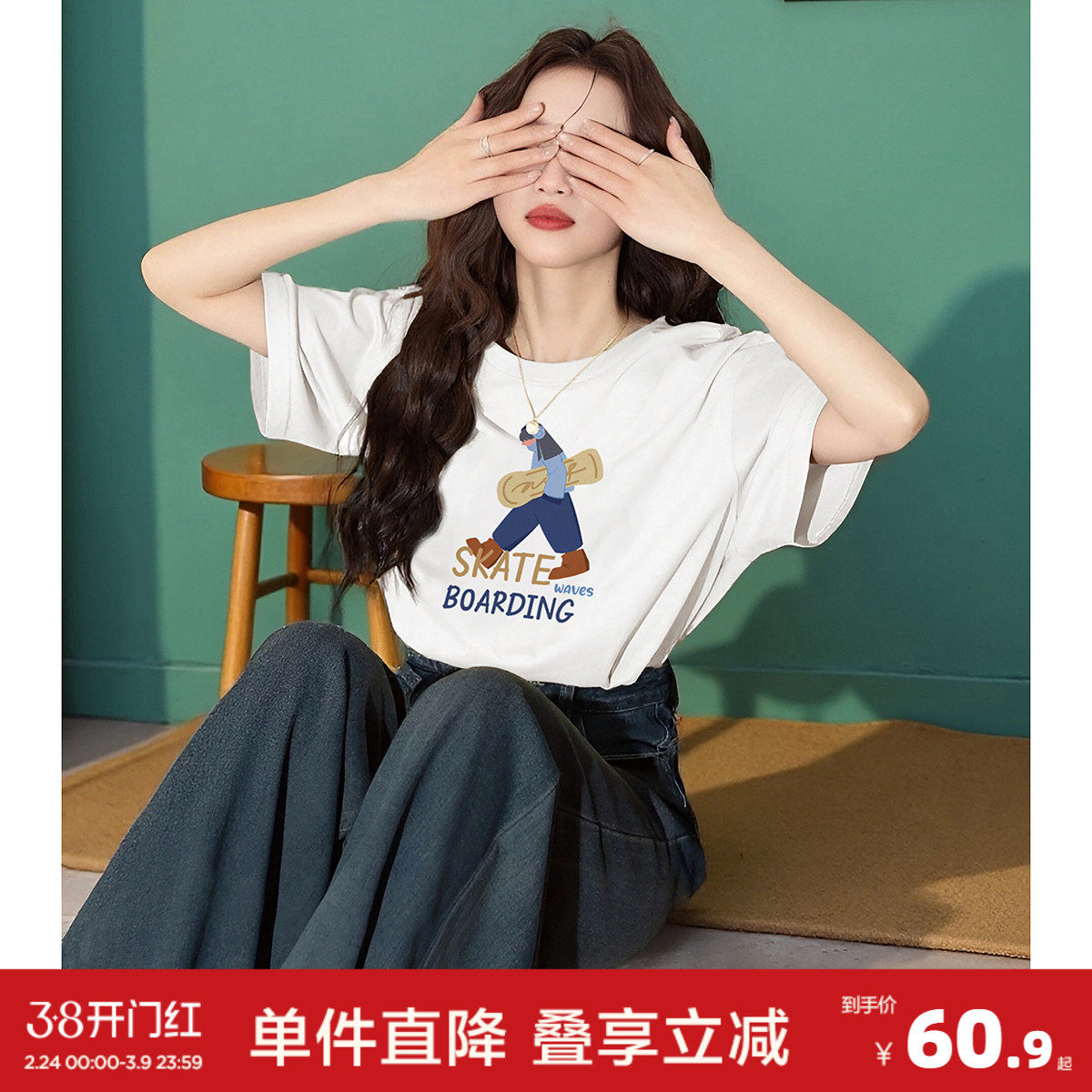 【99元2件】yoe短袖t恤女夏季休闲女装宽松白色上衣体恤女款学生