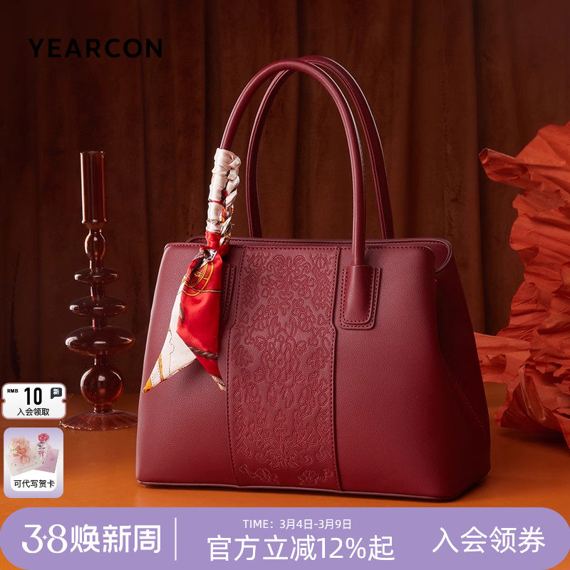意尔康妈妈包包新款手提包酒红色婚包刺绣大气中年女士国风斜挎包
