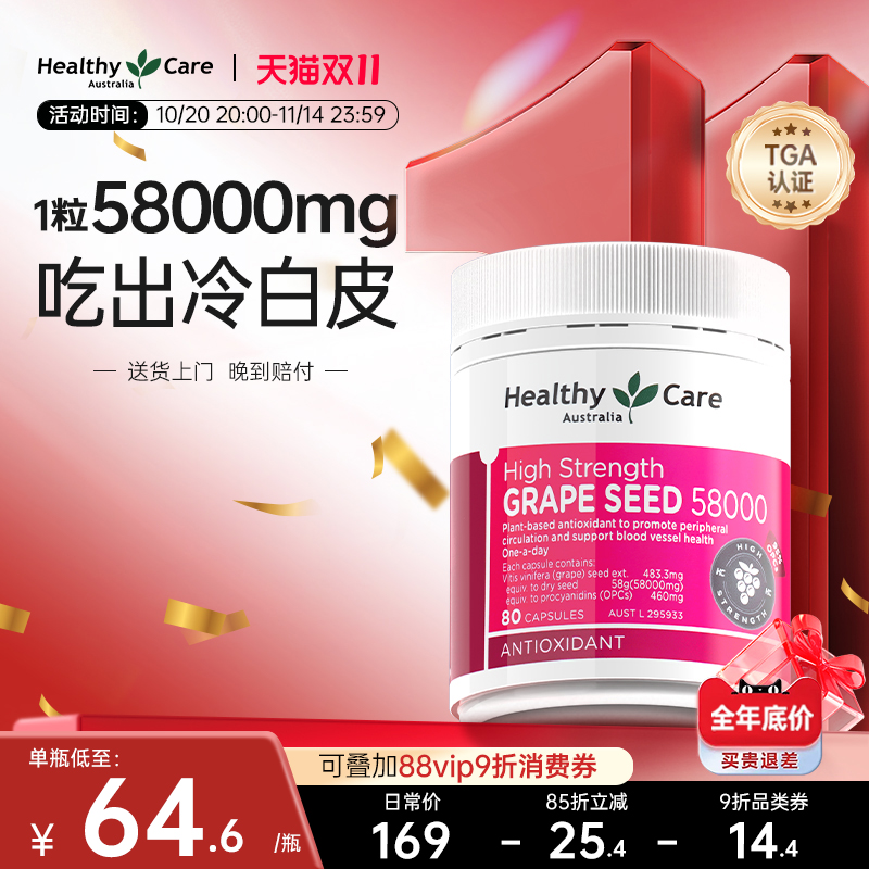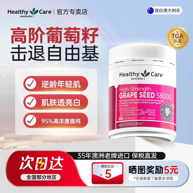 HealthyCare澳洲进口高浓葡萄籽软胶囊原花青素女保健品80粒官方