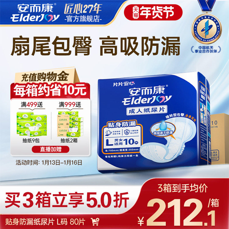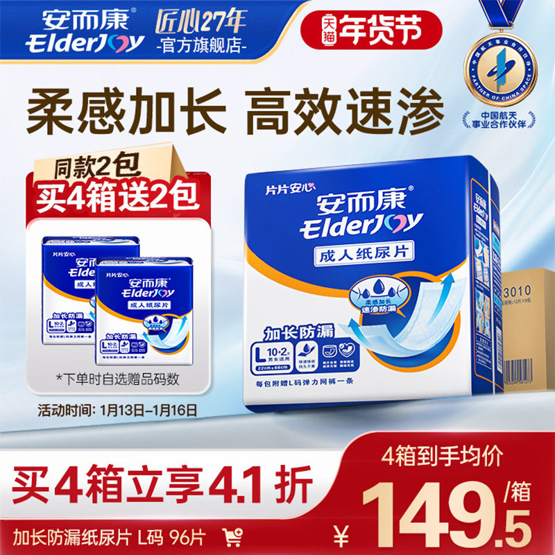 【百亿补贴】安而康成人纸尿片男女老人长条形隔尿垫ML码12片96片