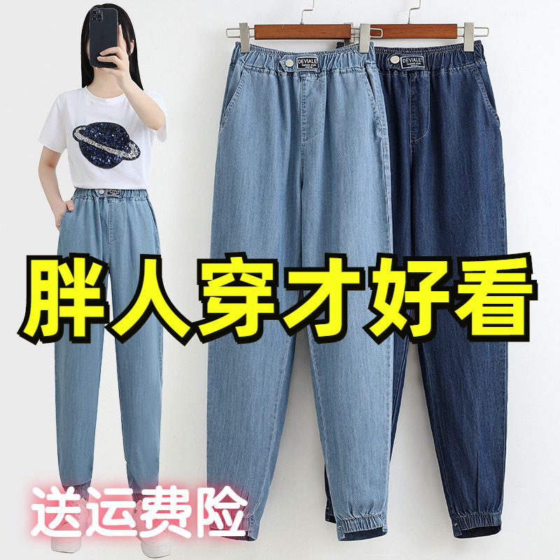 秋冬设计感垂感天丝牛仔裤女韩版宽松显瘦大码胖mm薄款休闲哈伦裤