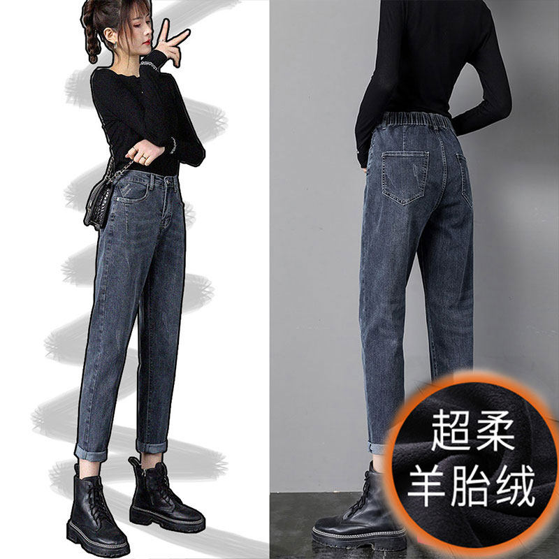 高腰弹力牛仔裤女秋冬韩版大码加绒加厚哈伦裤宽松显瘦系带长裤子