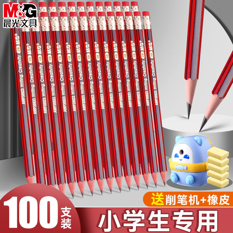 100支晨光铅笔小学生红杆2b六角杆hb带橡皮头一年级学习练字专用2比无毒铅安全素描绘画考试涂卡文具用品套装