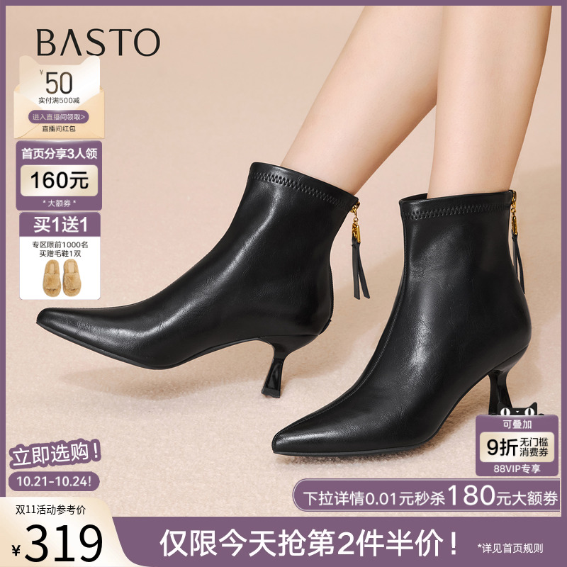 百思图2025冬季商场新款气质细跟尖头法式及踝靴加绒女靴W2073DD5