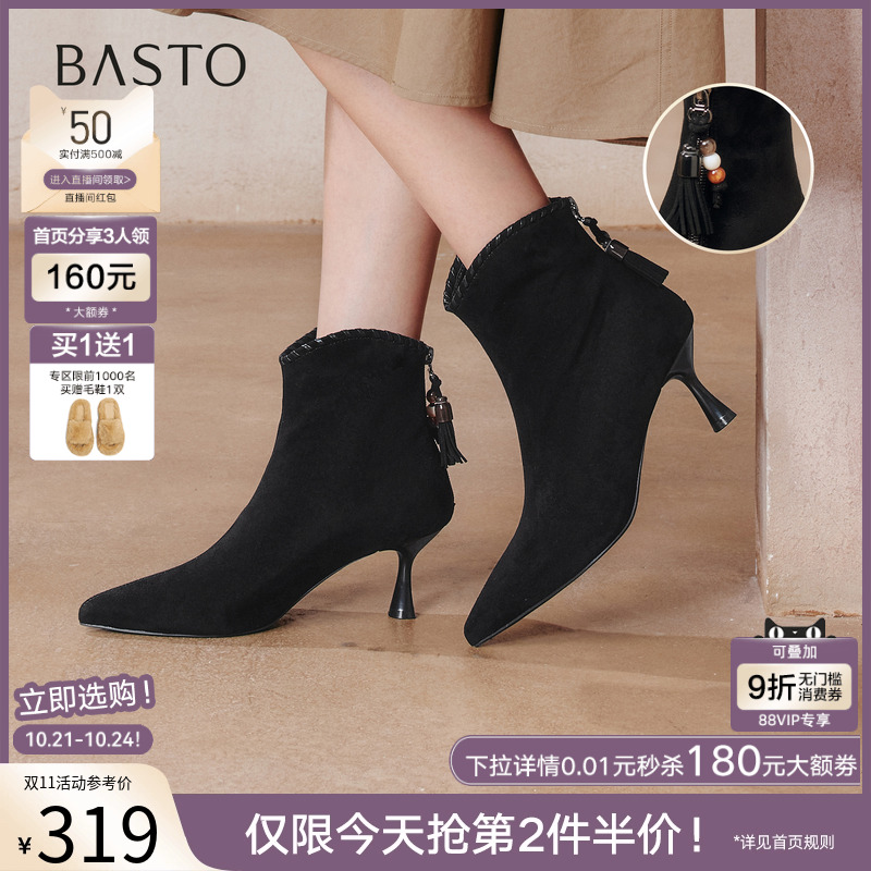 百思图2025冬季新款气质通勤细跟小踝靴尖头绒面女短靴W0131DD5
