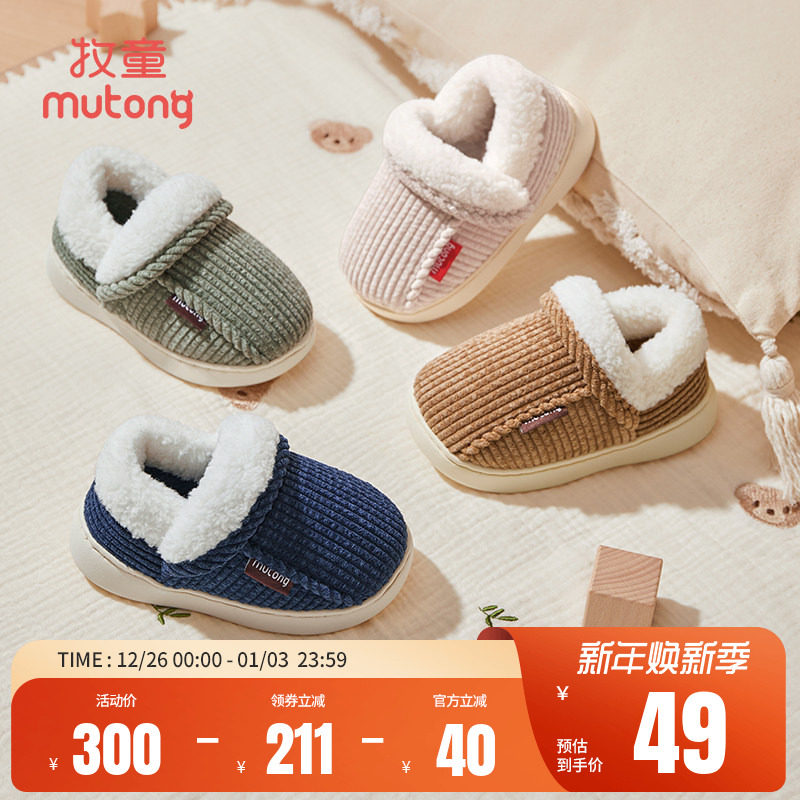 牧童小宝宝拖鞋2025秋冬新款薄绒棉拖鞋男儿童怀旧款包跟面包鞋女