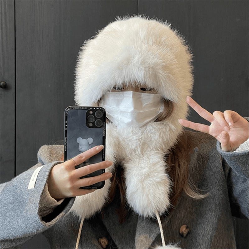 女士狐狸帽子獭兔蒙古帽冬季护耳公主围巾帽白色黑色女款皮草户外