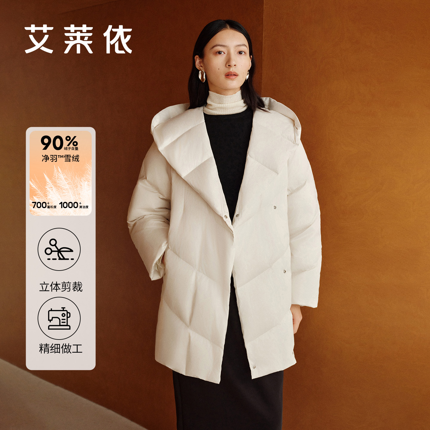 艾莱依2025新款羽绒服交叉式连帽领型立体剪裁高级大气中长款外套