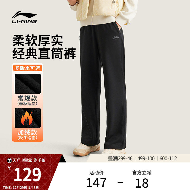 李宁卫裤女2025新款休闲黑色裤子秋冬季宽松加绒直筒针织运动长裤
