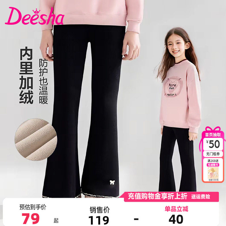 笛莎童装女童长裤冬季新款儿童女孩宝宝中童加绒喇叭裤洋气黑色裤