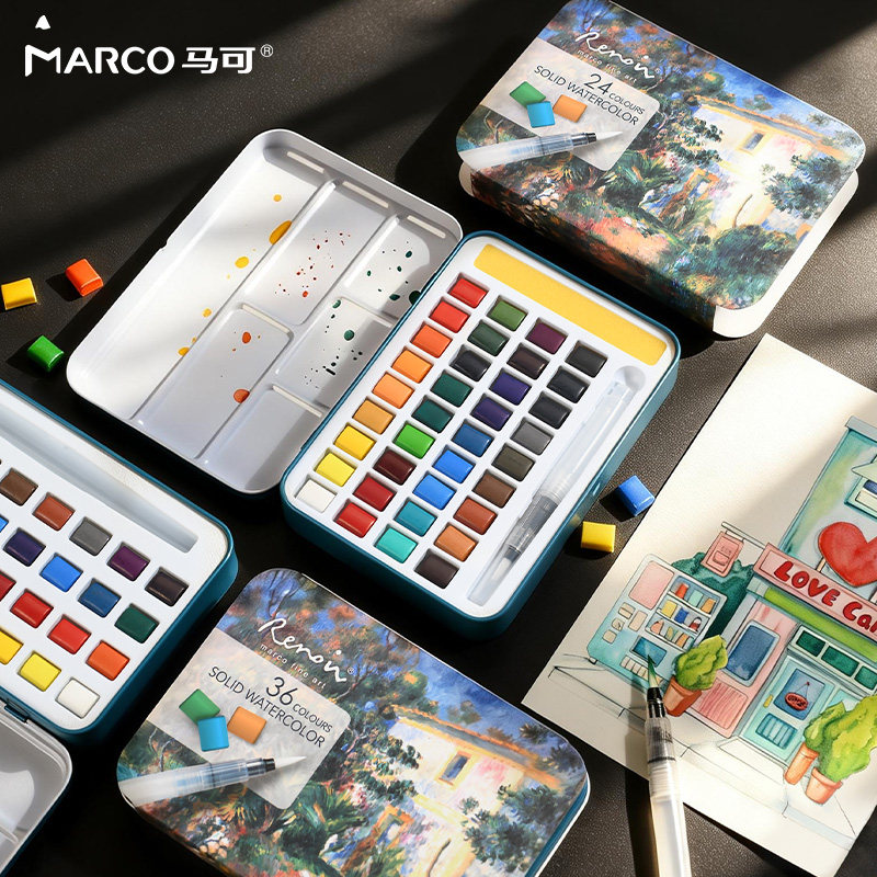 MARCO马可雷诺阿固体水彩颜料分装铁盒学生美术生专用水粉绘画画笔工具随身便携专业写生水彩画套装全套