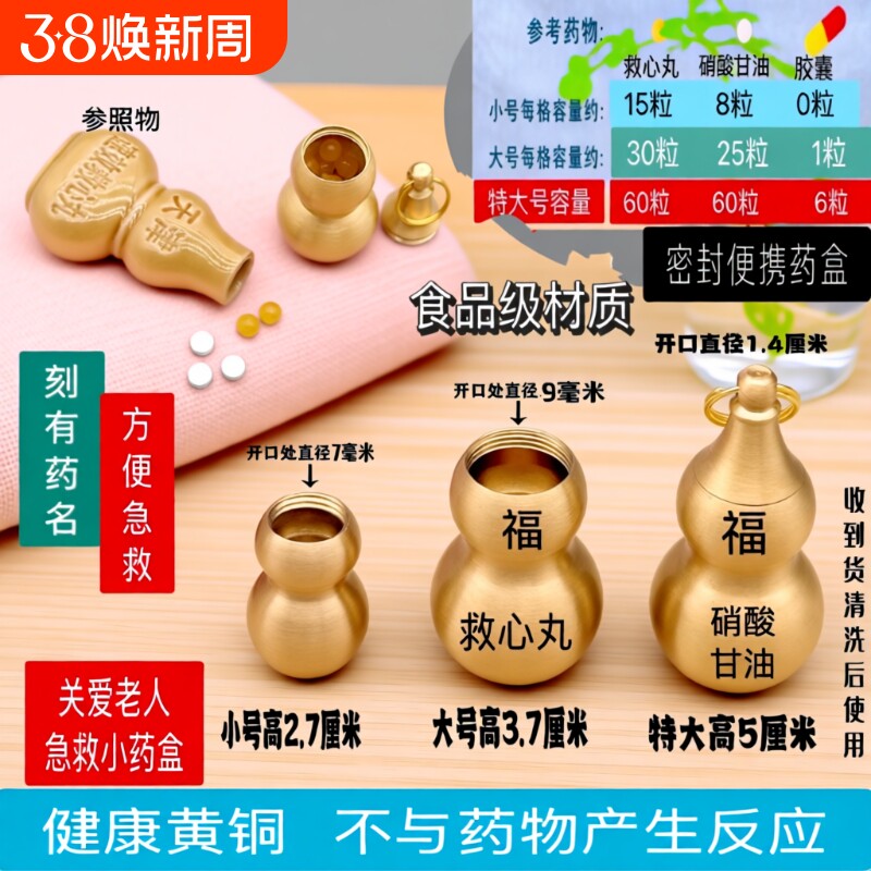 装救心丸空心葫芦随身便携药盒黄铜迷你钥匙扣挂件密封药瓶密封罐