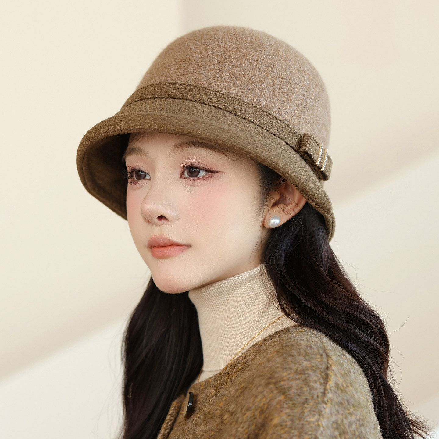 赫本风驼色羊毛呢礼帽女法式复古秋冬盆帽优雅黑色蝴蝶结灯罩帽子